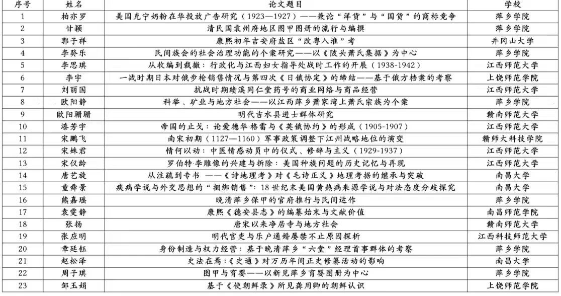 为进一步推进江西省内各院校历史专业学生学术交流,共同提高历史学专业人才培养质量,鼓励在校本科生和研究生积极进行学术研讨,第四届江西省历史学专业学生学术论坛暨“江右史学新秀奖”论文评选活动将于2025年4月26-27日于萍乡学院举行。