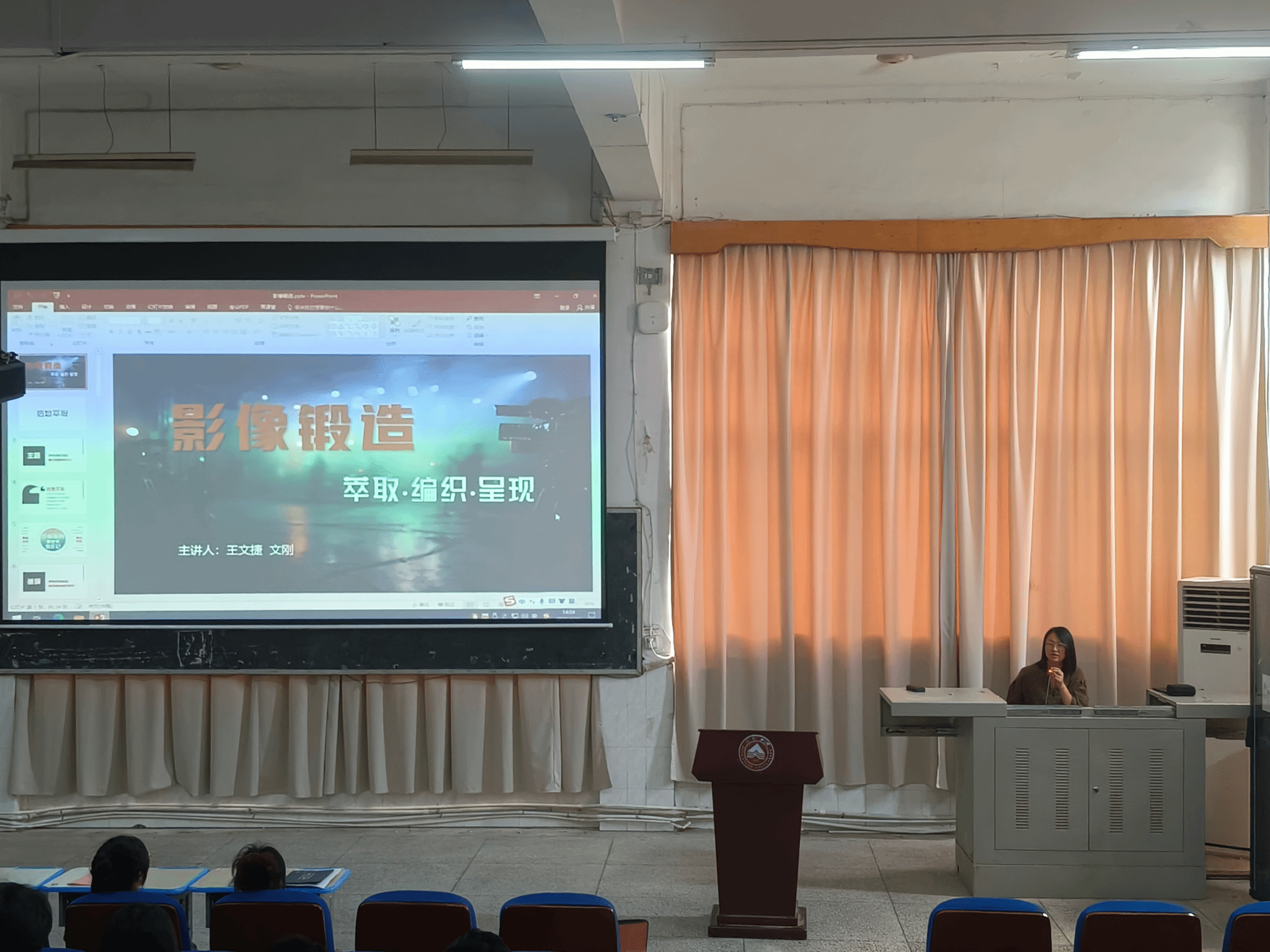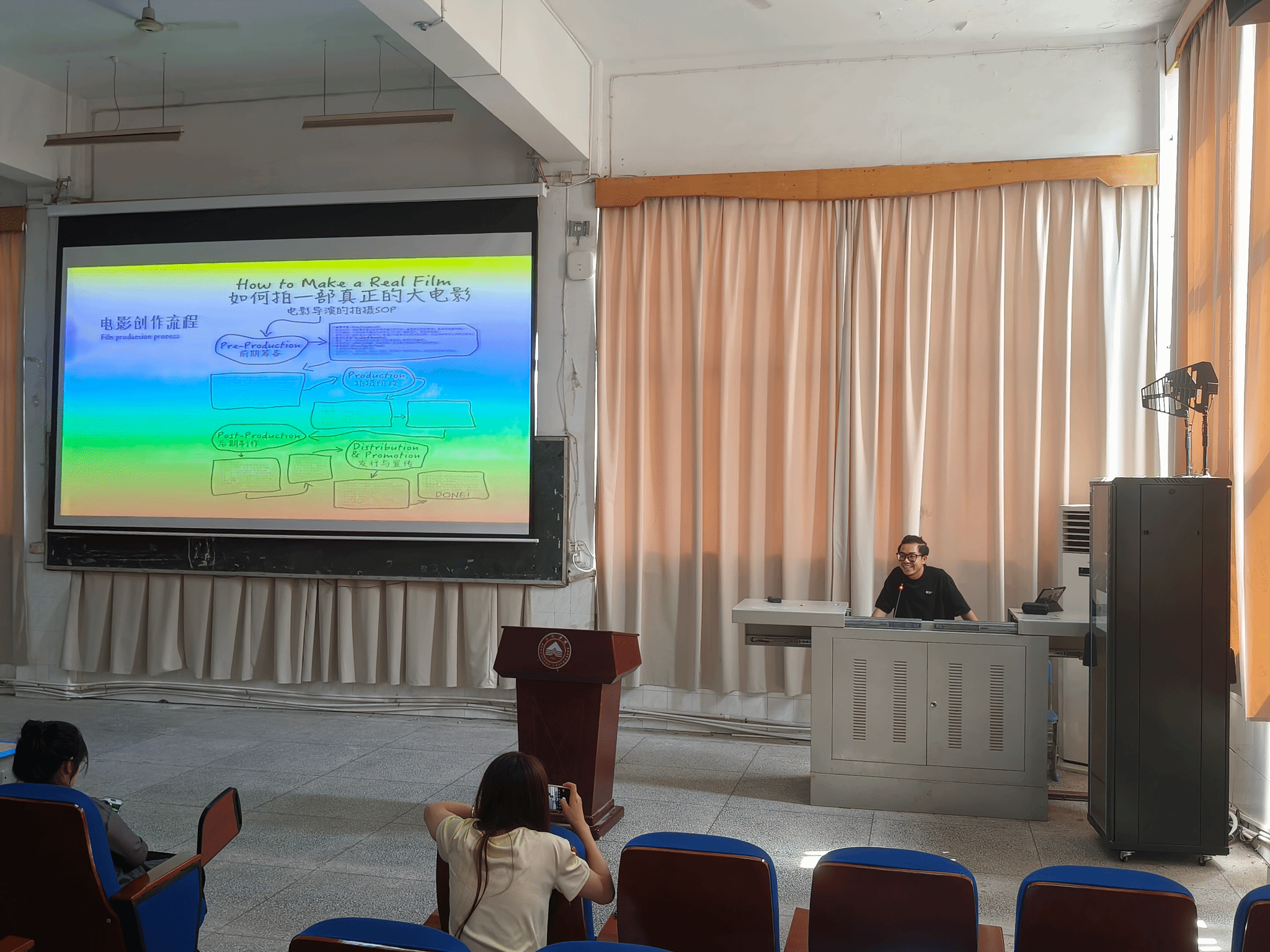 文刚从剧本打磨、分镜设计、多机位拍摄和后期剪辑等方面,讲述了一部电影作品的制作过程,让学生体会到电影制作的不易和电影幕后的“匠人精神”。他又向学生们介绍了拍摄的各种方法和各种术语,强调学习专业技术需落到实处。广播电视编导专业2021级学生徐继超分享了他与团队打磨电影作品的拍摄历程,让学生明白好的作品需要一个强大团结的队伍。