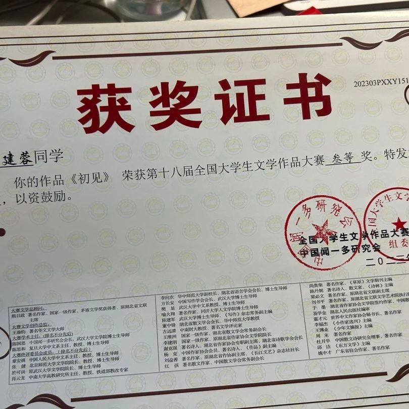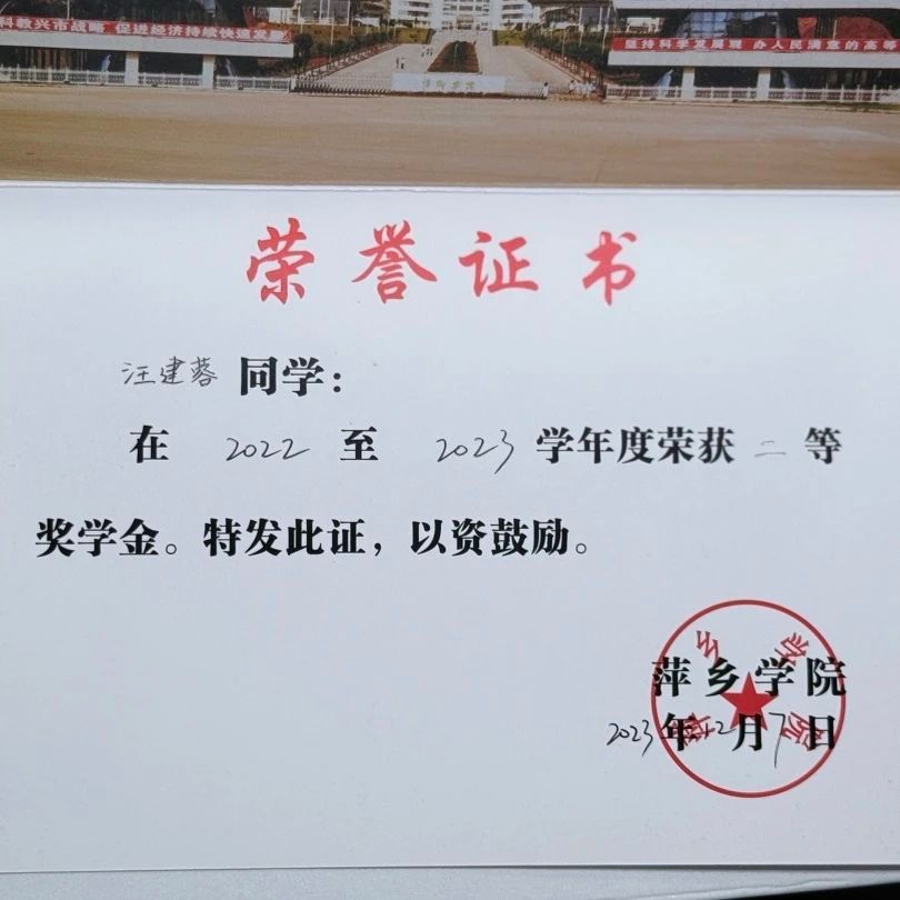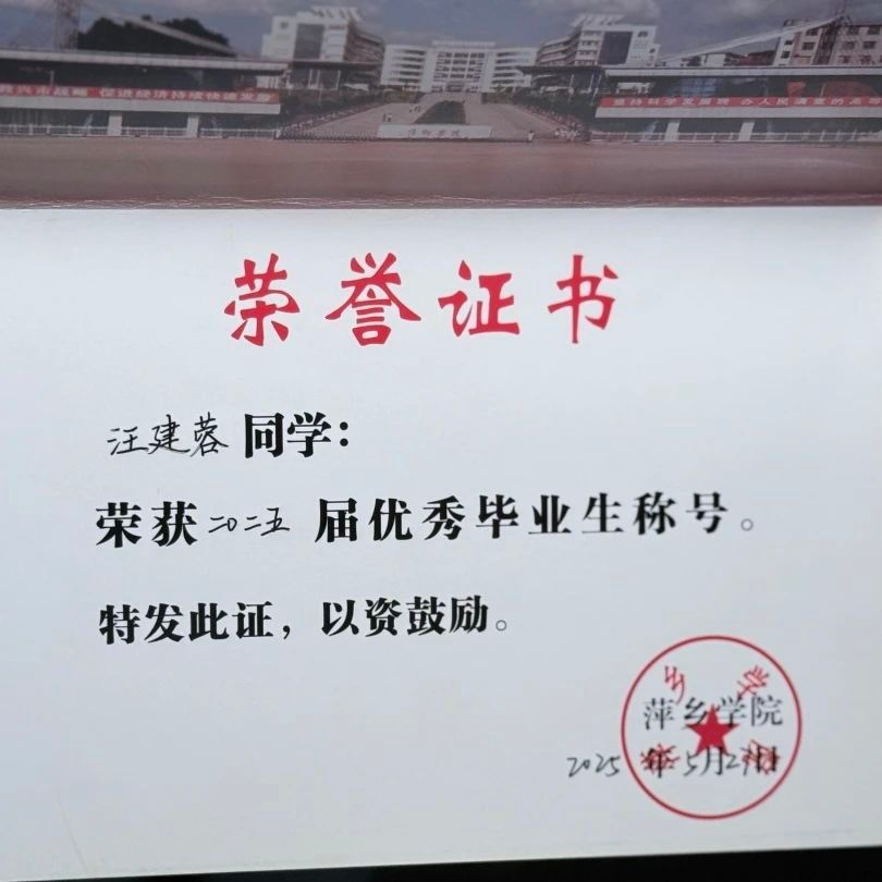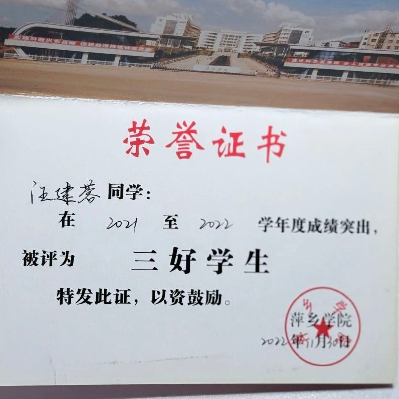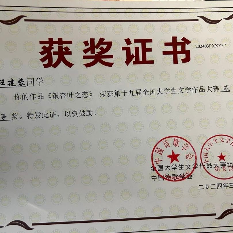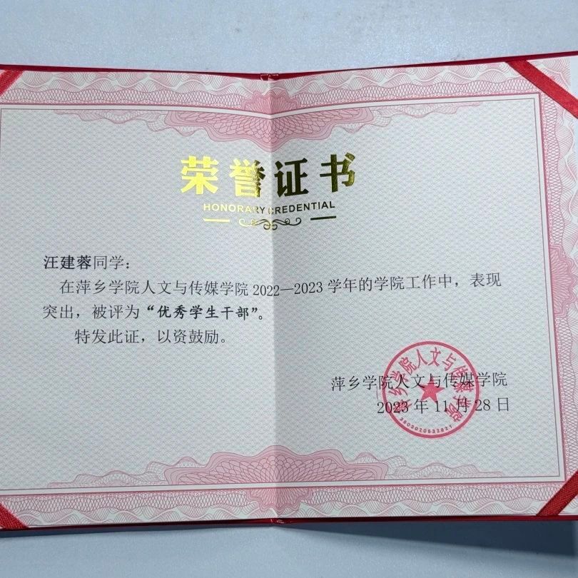 汪建蓉,汉语言文学2102班,在校期间坚持以学业为主,刻苦钻研,勤奋好学,成绩一直在班级的前列,多次获得校级奖学金,三好学生。曾担任学院学生会宣传部部长,任职期间,主要负责学院大小活动的新闻写作,积极配合老师工作,认真负责,荣获优秀学生干部称号。同时也曾获得优秀实习生,优秀毕业生等称号,现考研至江西师范大学,继续学业学习。