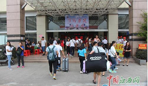 9月5日是萍乡学院新生正式报到日子,中国江西网记者在校园内看到,各类迎新标语映入眼前,在新生报到处门口,各学院的学生举着学院名称牌站满了通往报到处的楼梯台阶上,热情的等待着学弟学妹们的到来。拖着大小行李的新生和家长们也正忙碌地办理着入学手续。