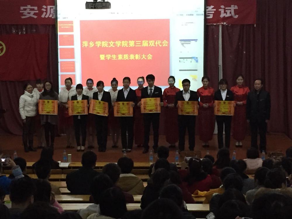 12月1日,萍乡学院文学院在跬步楼1115教室举行了第三届“双代会”暨学生素质表彰大会。文学院院长刘建明老师、文学院党总支书记吴芳老师、文学院副院长陈敢老师、文学院党总支副书记孙琦老师,以及多位专任教师和辅导员老师参加了此次大会,会议由文学院团总支书记黄如光主持。