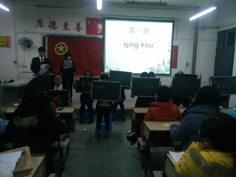 2015年12月15日,文学院在跬步楼1506教室举办了第三届汉字听写大赛决赛。本次大赛由文学院学生分会素拓学习部主办。文学院党总支书记吴芳老师,文学院副院长陈敢老师,文学院团总支书记黄如光老师,以及专任教师李海涛、黄娜、魏小芳、郭慧等老师观看了此次大赛。