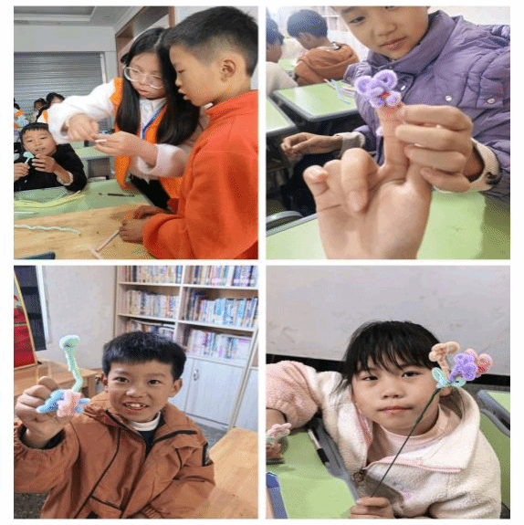 活动以一堂《飞夺泸定桥》红色宣讲课正式启幕。志愿者蒋程静以生动的讲述,重现了长征路上红军战士突破天险、英勇奋战的壮烈事迹。孩子们凝神聆听,被深深打动,纷纷表达要铭记历史、传承红色精神的决心。随后展开的趣味游戏环节迅速点燃现场热情。在志愿者张燕说明规则后,孩子们积极投入。在“精准投掷”游戏中他们专注投掷目标,在“薪火相传”游戏里默契传递纸张,在欢快互动中切身感受革命先辈团结拼搏、不畏艰难的精神力量。活动在温馨的扭扭棒手工制作中步入尾声。志愿者江心怡和李邦伟原计划指导技巧,却惊喜地发现许多孩子创意迸发,手指灵活地弯折缠绕,转眼间就制作出花朵、蝴蝶等生动作品,小朋友们还主动分享心得:“这样扭花瓣会更立体哦。”队员们与小朋友们进行角色互换,认真向孩子们请教学习。教学相长之间,课堂化作平等交流、共同成长的美好空间。