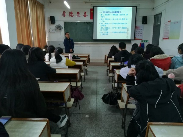 11月14日中午,文学院在跬步楼1507教室开展“学习十九大精神”讲座。文学院院长易志文主讲“学习党的十九大精神,开创中国特色社会主义美好未来”,16级中本1班全体同学参加讲座。