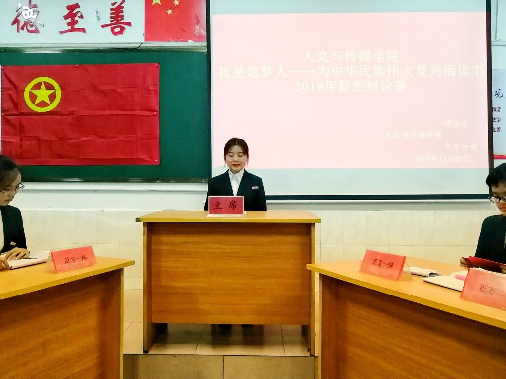 11月21日下午18:00,72886必赢欢迎光临在跬步楼1506教室展开2019年新生辩论赛顺。此次辩论赛以“我是追梦人——为中华民族伟大复兴而读书”为主题,共分三场,文传学院辩论队队员担任评委,72886必赢欢迎光临19级各班代表参赛。