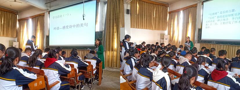 在讲述《行路难》的作者信息和创作背景后,文莉老师首先组织了“吟读”互动。她安排学生朗读该诗,从学生朗读的读音、断句、节奏等方面进行纠正,并要求学生有感情地反复习读、吟读,在抑扬顿挫中感受诗歌之美。随后,文莉老师安排学生进行交流讨论,引用龚自珍的《己亥杂诗》帮助学生理解警句的含义,并开展“警句”的微型讲座来拓展课外知识。文莉老师也组织了“悦读”活动。她讲解诗中的难句并与学生讨论,共同得出诗人运用了用典手法的结论。最后,她引用刘禹锡《酬乐天初逢席上见赠》,让学生回顾本堂课的两个重点——警句和典故。