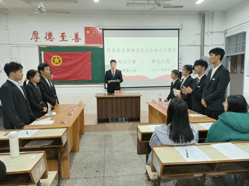 随着主持人精彩的开场白,比赛正式开始。正方是来自20历史班的四名选手,反方是来自20中本一班的四名选手。赛上,正反双方就“网络意见领袖对民众认知水平提升利大于弊/弊大于利”的辩题展开激烈辩论。正方持利大于弊的观点,反方持弊大于利的观点。