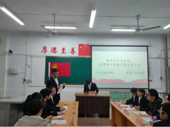 本次辩论赛的辩题为:成年后外出生活,过得好不好要不要告诉父母。信息与计算机工程学院为正方,持“成年后外出生活,过得好不好要告诉父母”的观点;我院为反方,持“成年后外出生活,过得好不好不要告诉父母”的观点。
