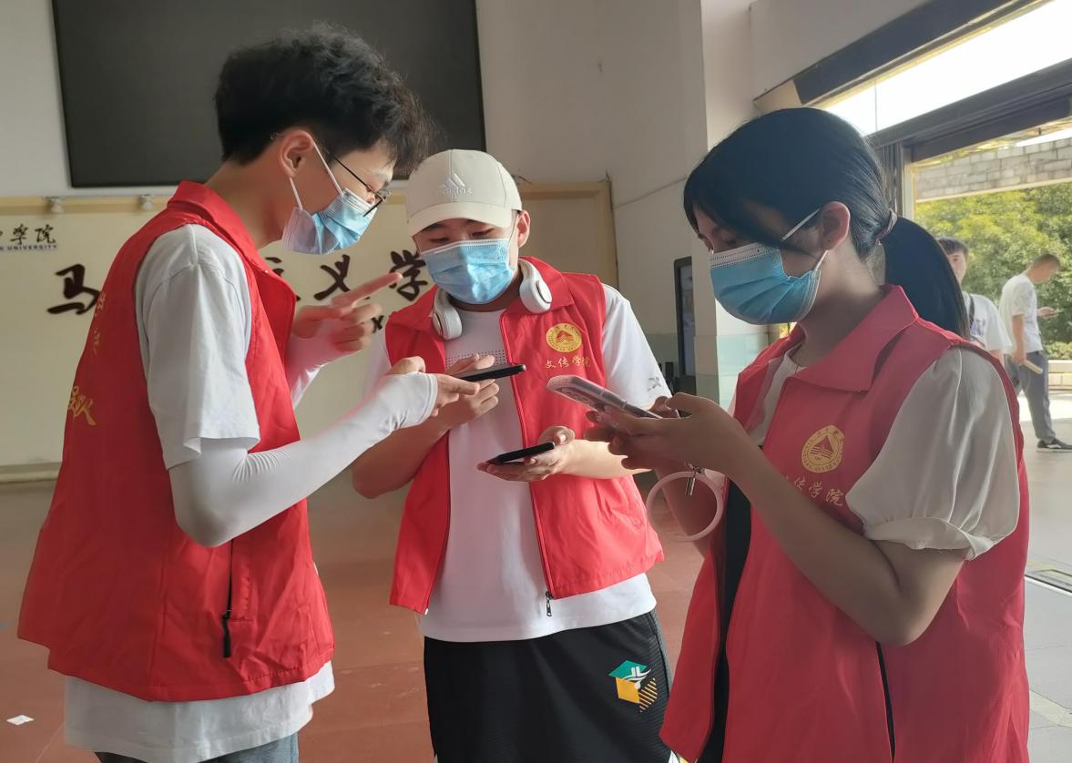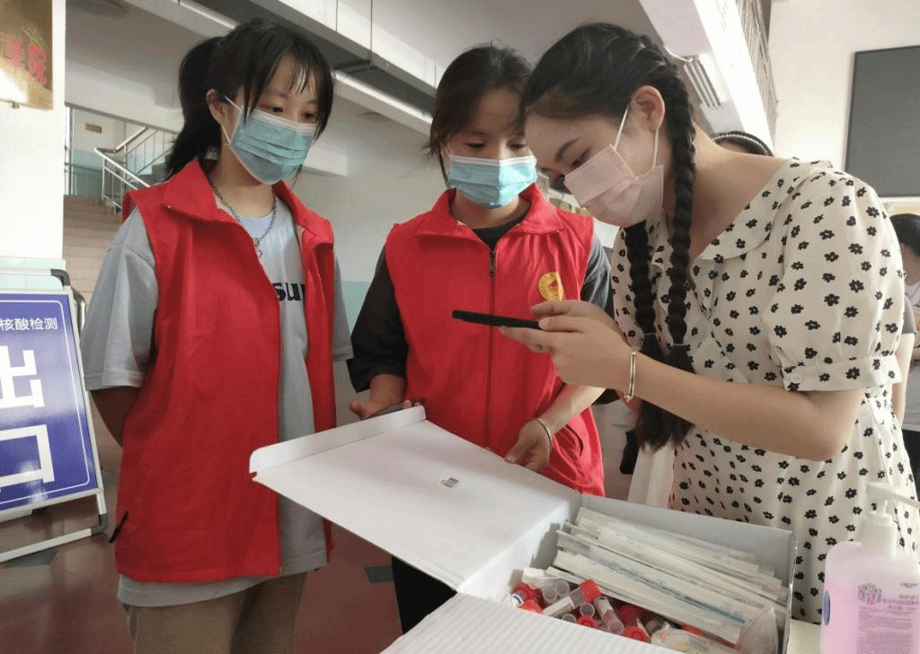 下午一点左右,室外温度高达38度,志愿者们参与志愿服务的热情也如同烈日一般滚烫,他们早早地就来到了跬步楼一楼,协助护士们开展核酸采集的准备工作。很快,一楼便排满了长队,各位志愿者们迅速分工,帮助现场的两名护士拆卸咽拭子、引导学生扫码和维护现场秩序。汗水浸湿了大家的衣衫,但这仍抵挡不住他们进行志愿服务的热情。有了志愿者们的加入,核酸采集的效率大大提升,短短几个小时就完成了全院师生的核酸采集工作。