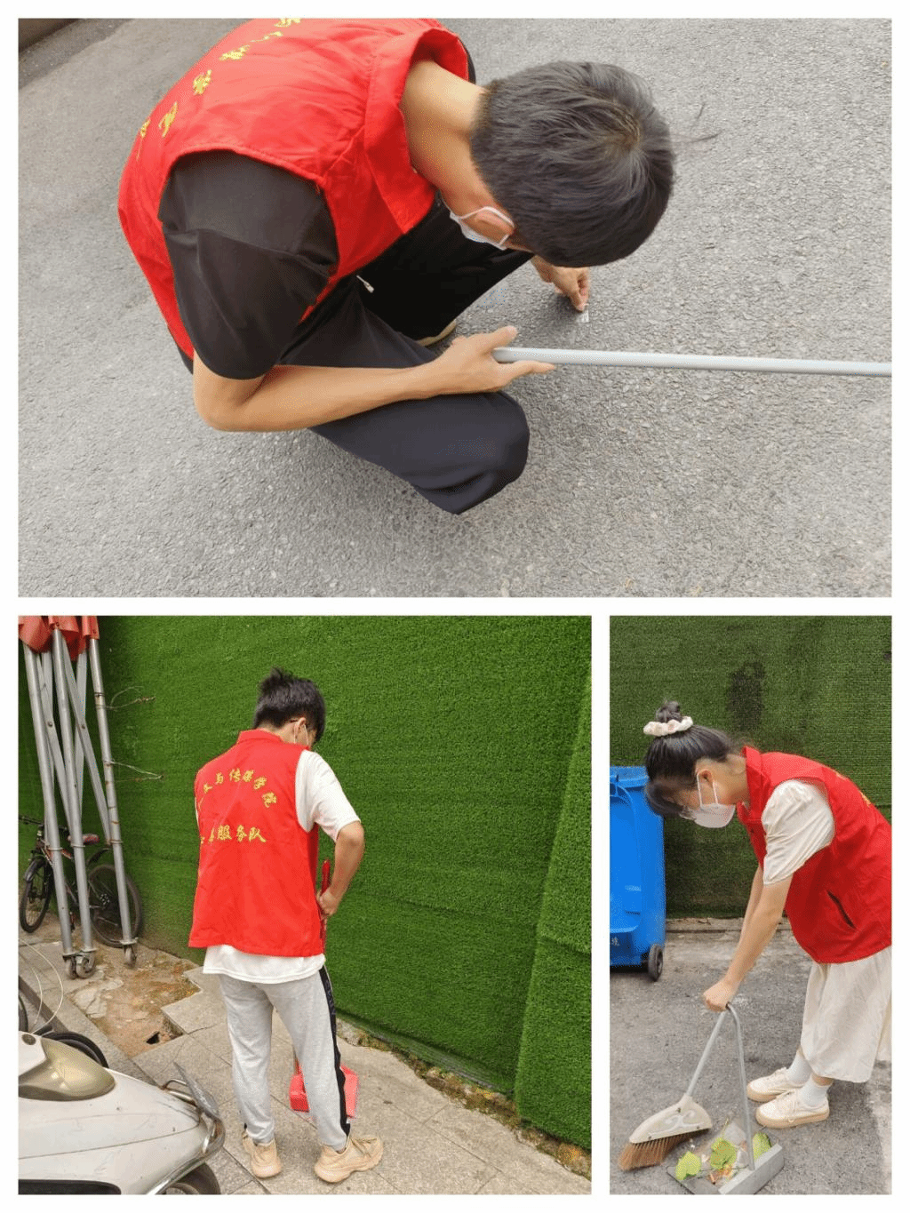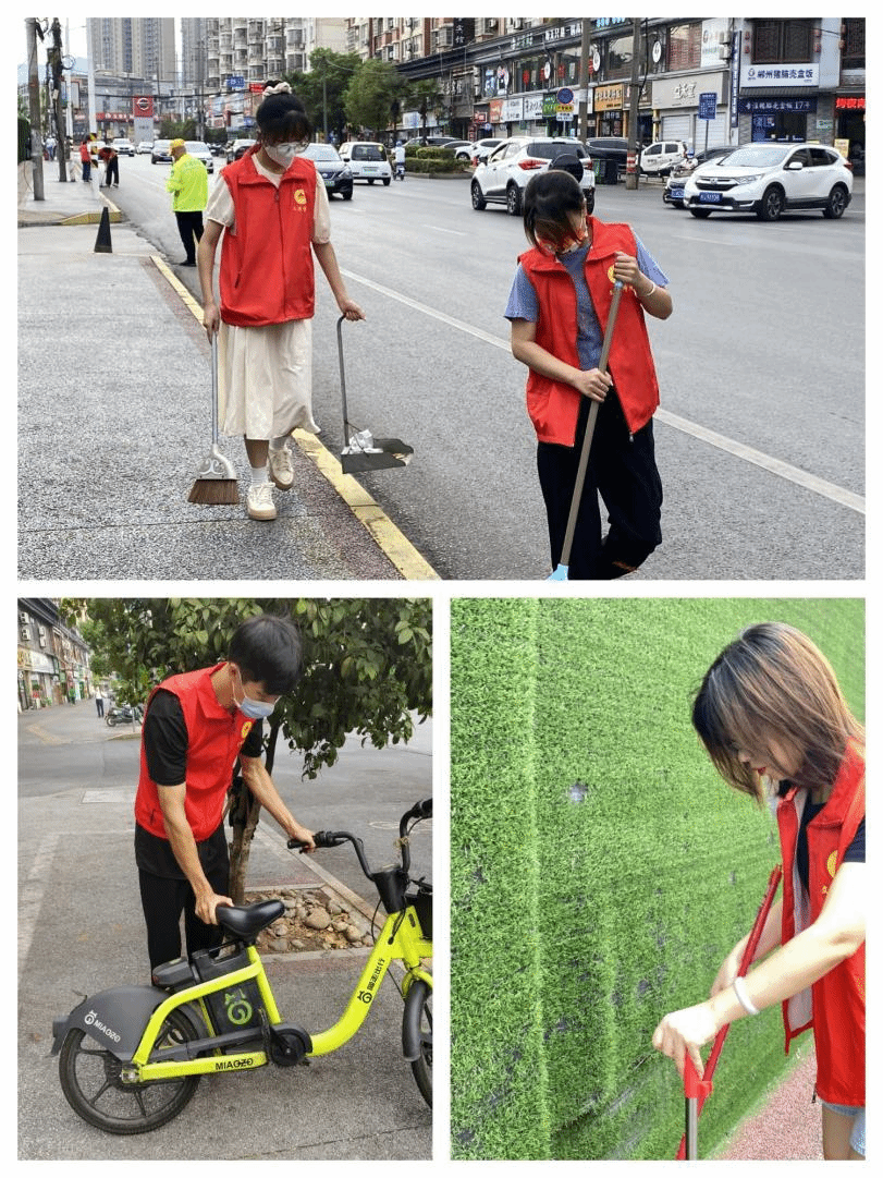 在南校门外街,党员老师们与入党积极分子一起对街道卫生、停车摆放等工作进行了帮创。他们带着积极向上的精神面貌和高度负责的心理,对每一个死角、每一处顽垢都进行了细致的清理,不厌其烦地扶起摆正街边的每一辆单车。清晨的街道上,穿着红色马甲,手持劳动工具的志愿者们在川流不息的车辆和行人中间,形成了一道亮丽的风景线。