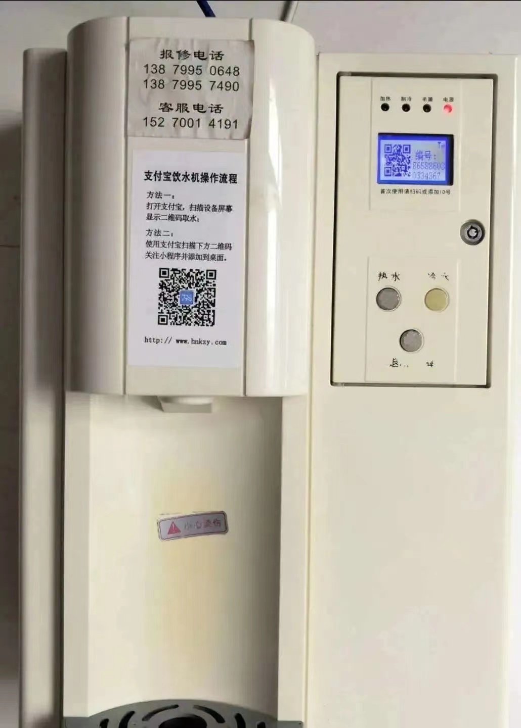 饮水:在寝室的门外,会有一个如图一的饮水机。我们只要打开手机支付宝,进行扫码、添加设备(设备编号就是饮水机屏幕上的数字噢),就可以接水啦。注意热水不要接太满,小心烫伤噢。