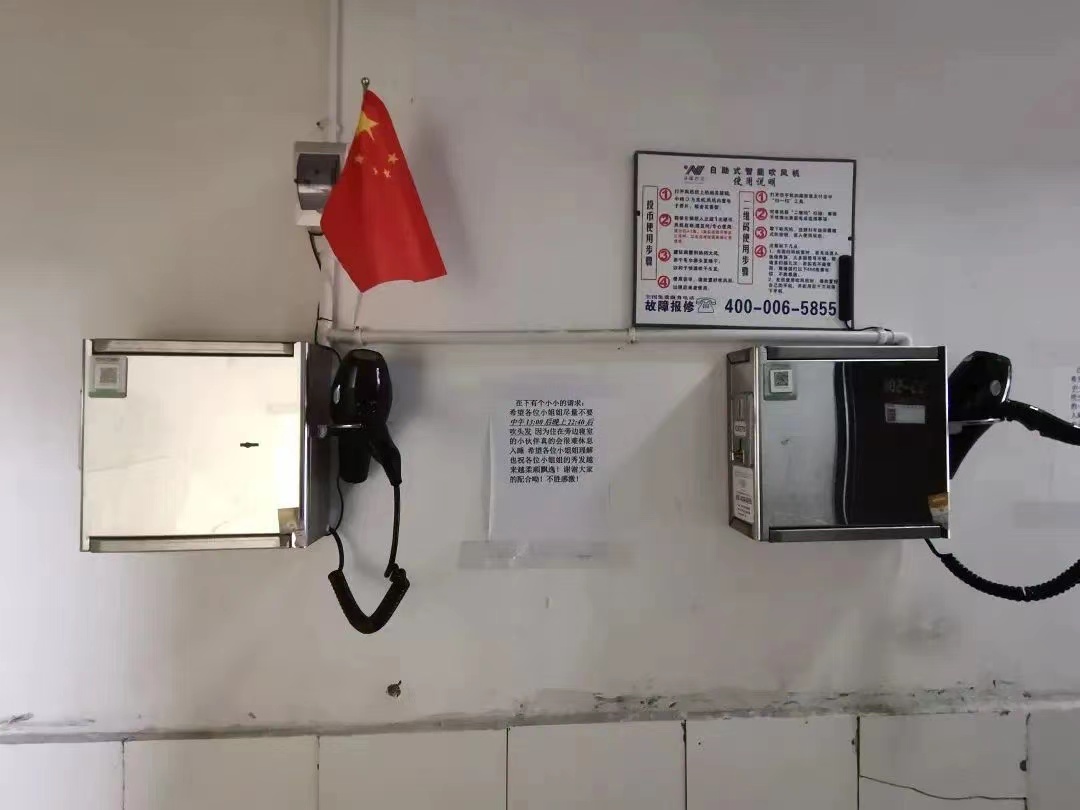 吹风机:在每层宿舍都配备两台吹风机。可以按照提示,进行投币使用,或者扫码使用。使用一次十分钟,每次消费1元。但是也需要注意的是,要合理把握使用时间,以免打扰他人休息。