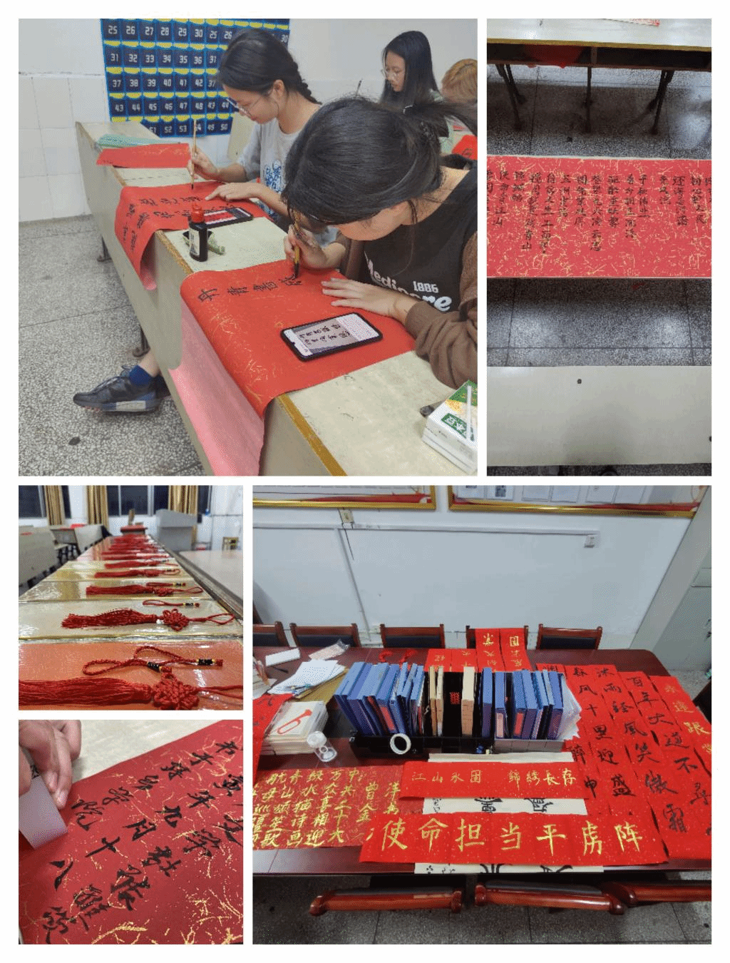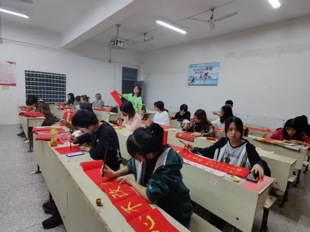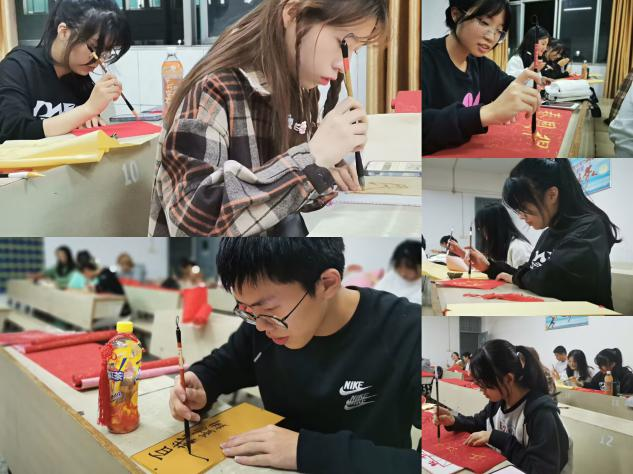 在一片喜气洋洋的的热闹声中,伴随一张张红色宣纸的传递,本次书法活动正式开始了。参赛选手准备好墨碟和毛笔,将红色宣纸仔细裁剪,铺展在桌面上。他们坐立端正,手执毛笔,认真地书写下迎接党的二十大的华丽篇章。笔墨芳香氤氲在间小小的教室里,柔软的笔尖在红绸般的宣纸上闲庭信步。活动接近尾声,各位选手已进入“身外无物”之境,手执毛笔,在红色宣纸这片天地上大施拳脚,毫不吝啬。最后,大家陆续完成了作品,自信满满地递交上去。周围的同学不时发出一声惊叹:“写得真好!”