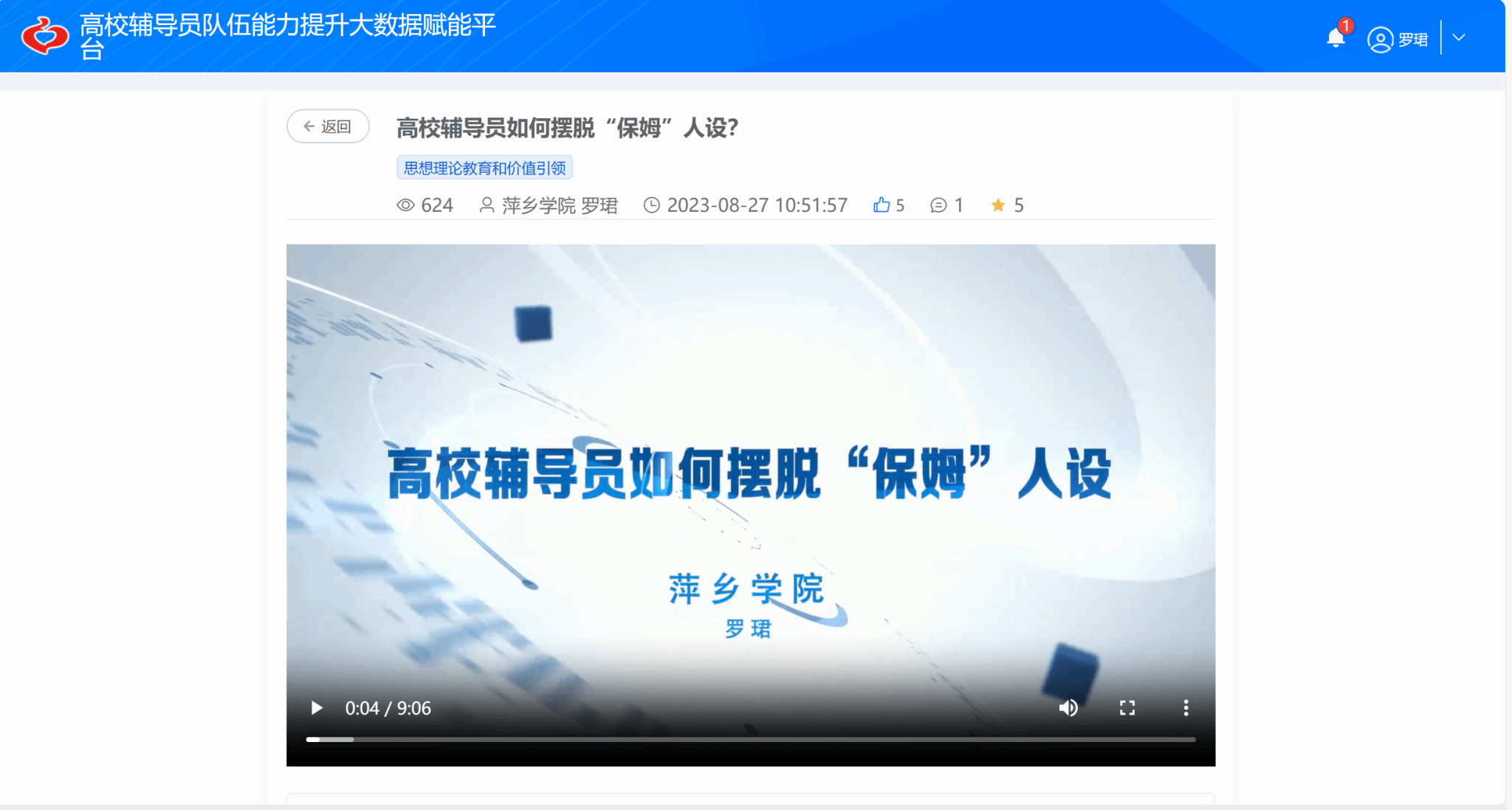 近日,高校辅导员队伍能力提升大数据赋能平台优质资源征集活动入选作品陆续发布,经学校、江西省教育厅、中国高等教育学会辅导员工作研究分会逐级审核推荐,72886必赢欢迎光临学工科副科长(团委书记)、专职辅导员罗珺的网络课程视频作品《高校辅导员如何摆脱“保姆”人设?》成功入选。