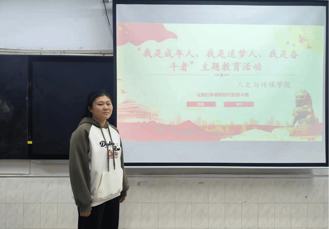 活动伊始,张雅妮通过PPT的形式向大家介绍活动主题,并重点围绕“我是成年人”“我是追梦人”“我是奋斗者”三个方面,用生动的事例、丰富的语言、真实的情感,讲述了优秀青年立足岗位追逐梦想、奉献青春的感人事迹,向同学们阐释坚持追梦的重要意义,并号召大家珍惜韶华、锐意进取、感恩励志、勇追梦想,在最好的年华,用拼搏努力赢得精彩人生。