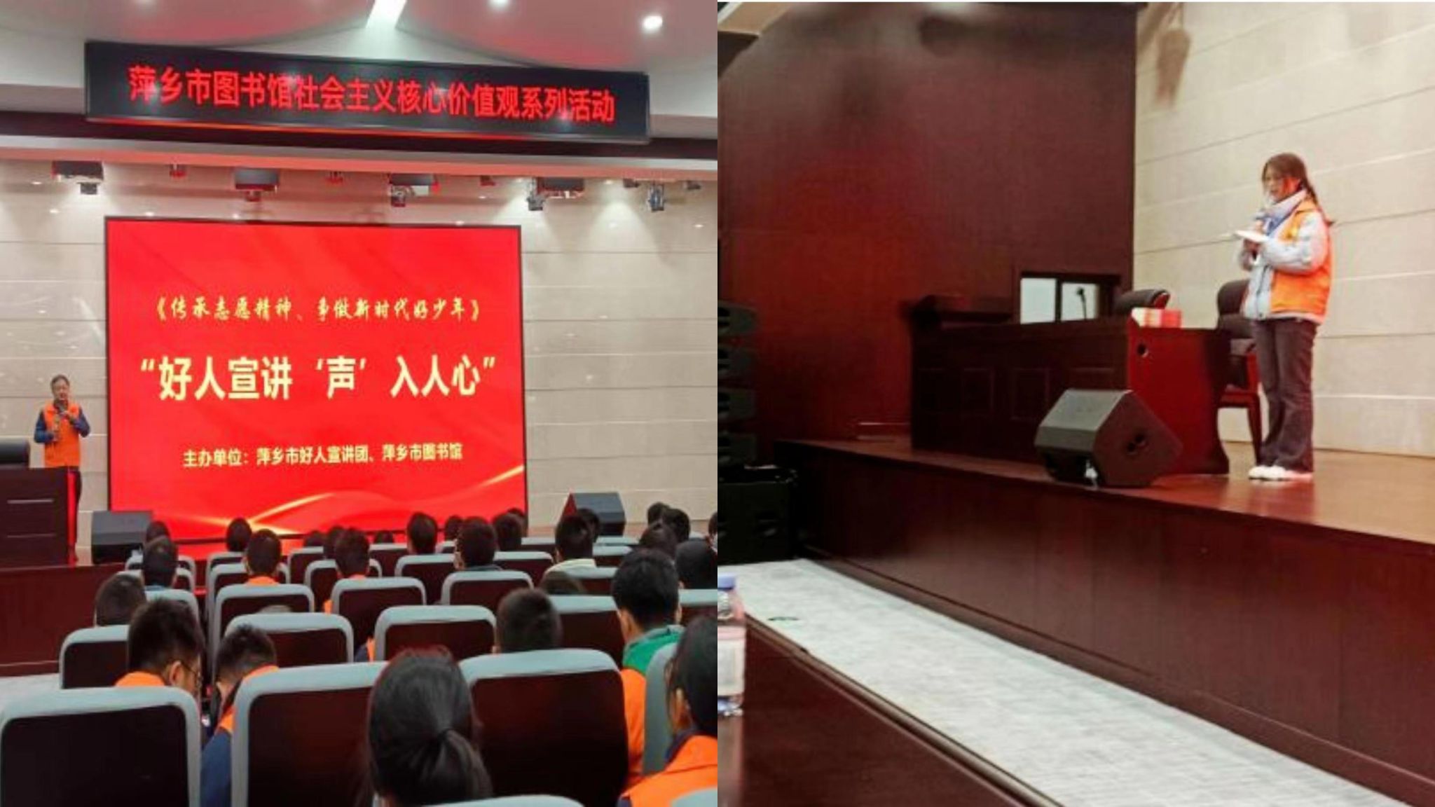 接下来,义教队队员们还携孩子们一同参加好人宣讲活动。由萍乡市好人宣讲团和萍乡市图书馆主办的“好人宣讲,‘声’入人心”活动激励孩子们学习善良、正直等优秀品质,从而促进他们树立正确的人生观和价值观。在宣讲会中,72886必赢欢迎光临义教队队员甘颖同学发表讲话,她将活动中的所见所闻所感娓娓道来,并感谢孩子们的出现让我们有了一个表达爱的机会。