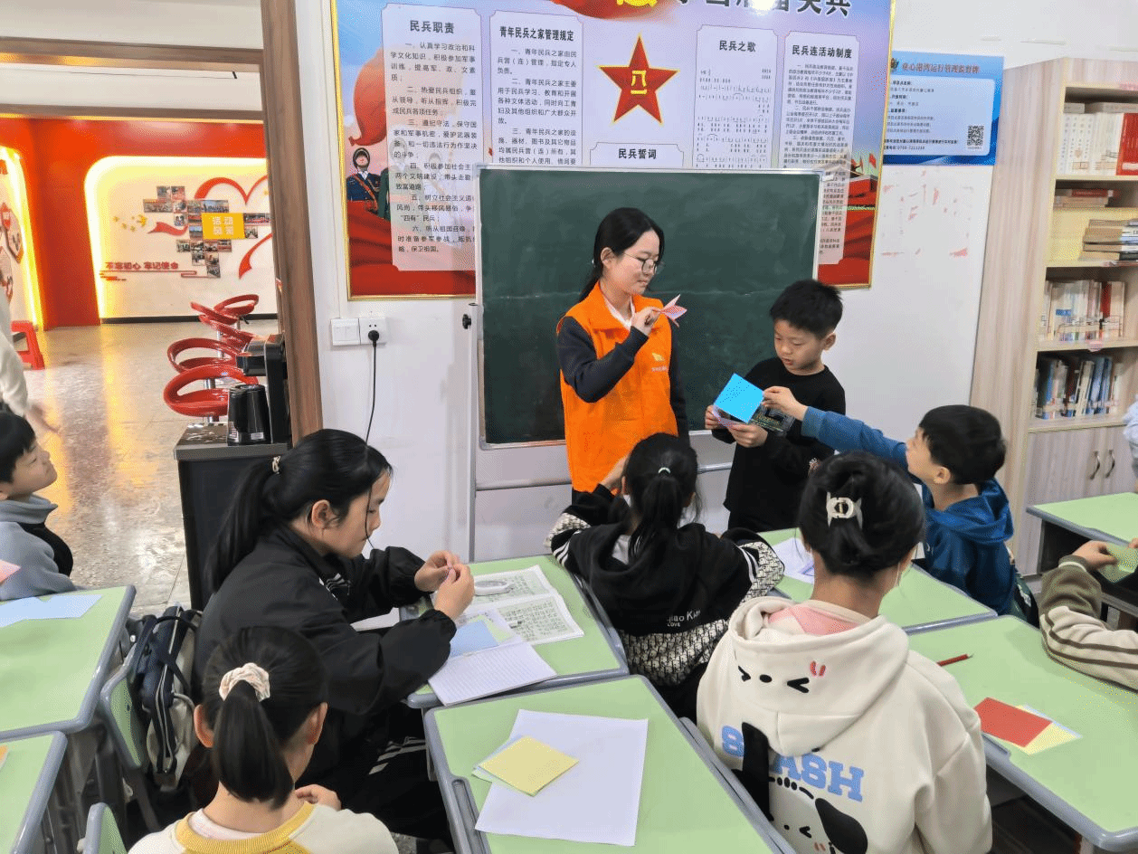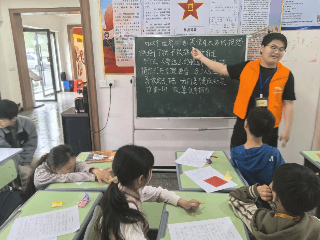 志愿者周子琪为孩子们带来了一堂生动有趣的手工课—折纸。在周子琪的耐心指导下,孩子们纷纷动手尝试,一张张普通的卡纸在他们的巧手中变成了形态各异的小动物、花朵和飞机。完成折纸后,孩子们的脸上都洋溢着成功的喜悦和自豪的笑容。