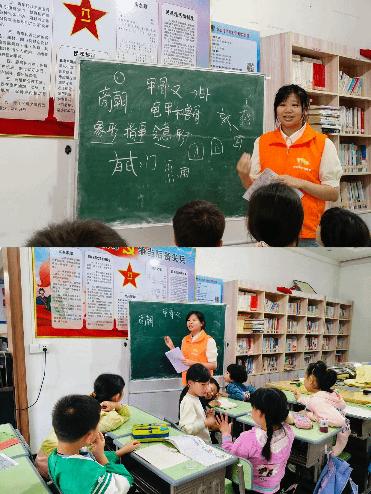 义教队队员徐玲艺为孩子们介绍了甲骨文知识,从甲骨文的起源和造字法等方面来讲解,让孩子们感受甲骨文的魅力,激发孩子们对古文字的兴趣。