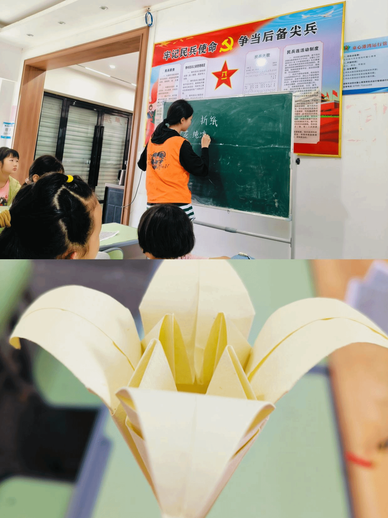 义教队队员雷佳婷为孩子们带来了一堂手工折纸课。她向大家展示漂亮的折纸——玉兰花。折纸充分调动孩子们的积极性,培养他们的动手能力,激发孩子们无限的创造力,孩子们在动手过程中找到了乐趣和成就感。