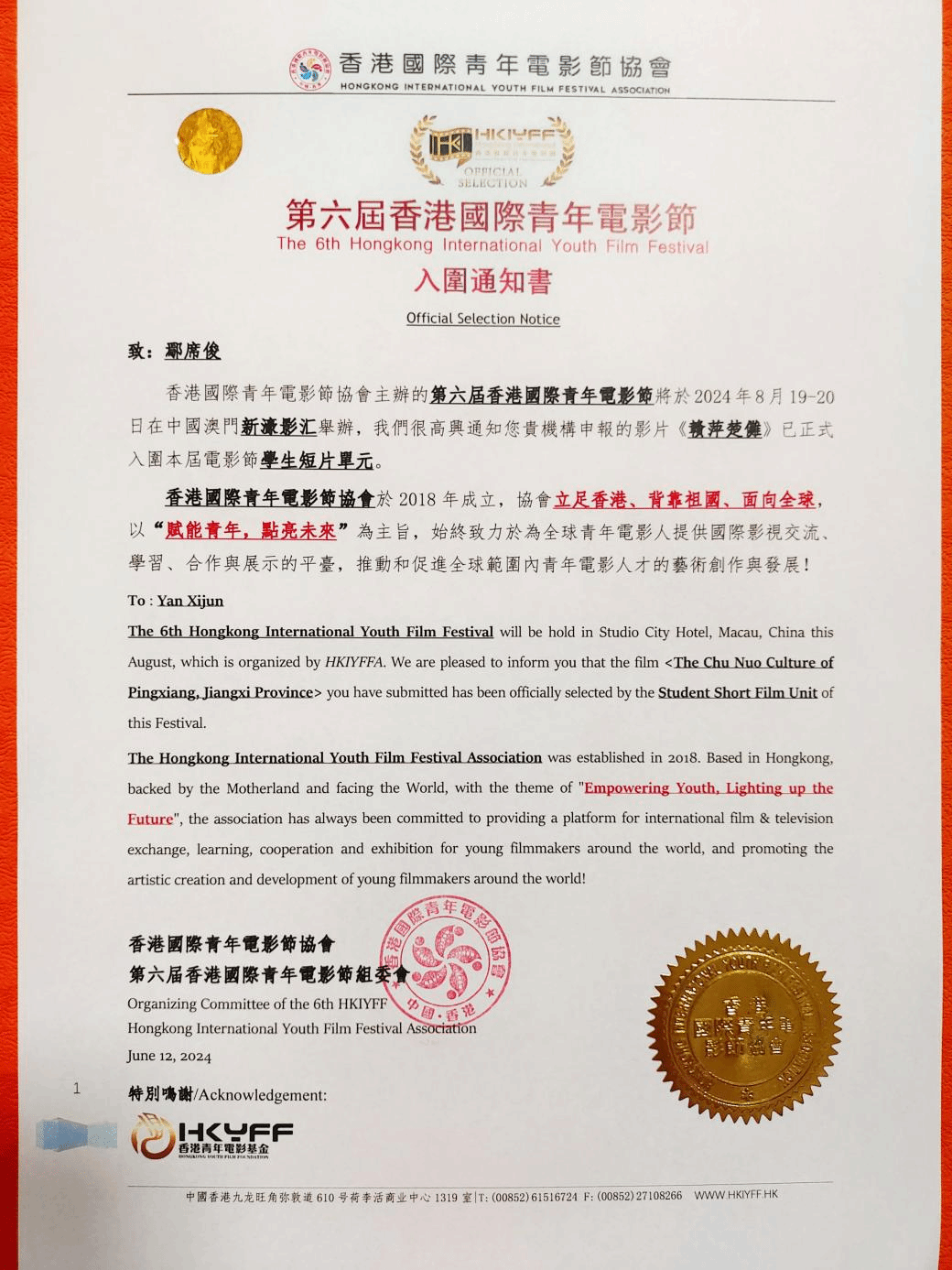 72886必赢欢迎光临广播电视编导专业1902班鄢席俊的毕业作品《赣萍楚傩》入围第六届香港国际青年电影节!