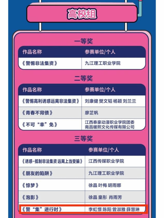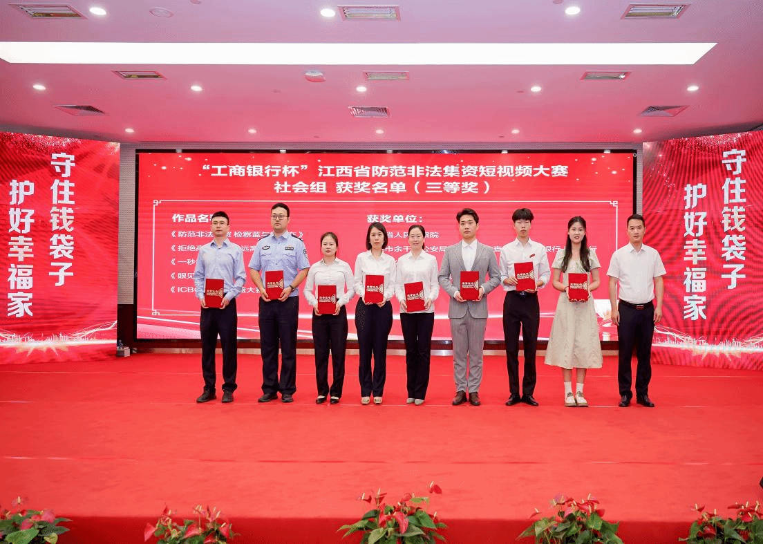 6月14日,由江西省地方金融管理局、江西省公安厅、共青团江西省委主办,工商银行江西省分行承办的江西省防范非法集资短视频大赛颁奖仪式在江西南昌举办。大赛共分为社会组、高校组两个组别,每个组别入围30件视频作品,再由主办方组织召开专家评审会,对入围作品评选出一、二、三等奖和优秀奖。