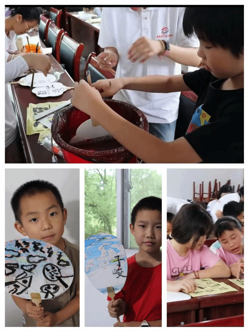 服务团成员先给小朋友们组织了书法练习,为漆扇绘制做足准备。成员们手把手教小朋友如何控笔、提笔等,在一撇一捺中体会书法魅力。随后,成员们耐心地为小朋友们讲解了漆扇制作的具体流程和细节。小朋友们拿起毛笔认真地装饰扇面,将绘制好的扇子浸入彩漆中,在经过入水、摇晃、旋转、出水等一系列步骤后,制作出了各种纹样的漆扇。小朋友们看着自己亲手制作的漆扇,脸上洋溢着自豪与喜悦的笑容。