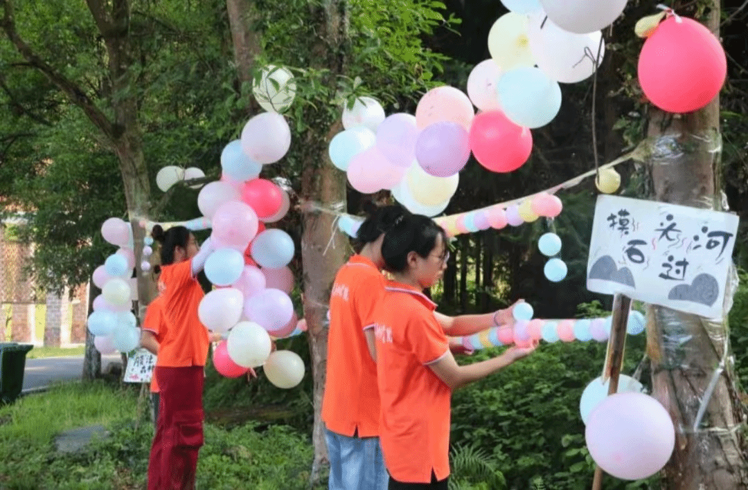 本次运动会选址为冲头村民族森林公园,服务团充分利用自然环境优势,将绿色、自然、和谐的理念贯穿始终。他们巧妙利用树木、花草等自然元素进行装饰,营造出一种清新、舒适、放松的氛围。以森林为依托融入各类运动项目,增添更多自然元素和自然趣味,通过大自然让小朋友身心愉悦、释放情绪。活动现场在充满“野趣”的同时,更融入了“情趣”,体现人文关怀。在准备阶段,服务团成员精心绘制横幅、加油标语,协力制作游戏道具、指示牌,用气球营造温馨氛围,为活动增添欢乐。运动会的选址布置展现了独特的创意和心意,更让小朋友们感受到亲切与温暖。