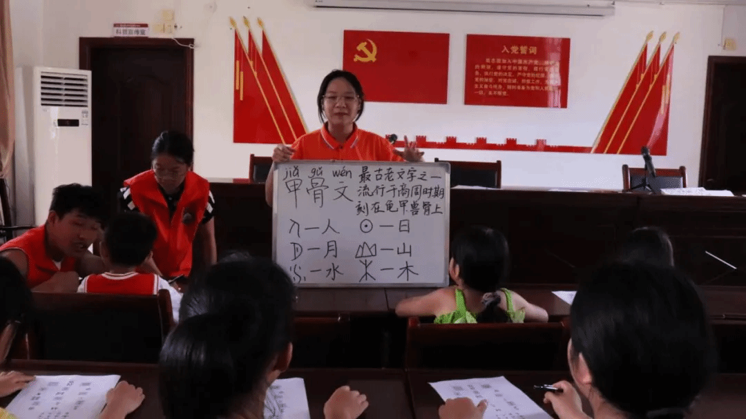 为探寻中华文明,学习甲骨文字,服务团成员向小朋友讲解了一些常用字的形态与意义,并设计了“甲骨文猜猜猜”游戏和甲骨文创意绘画环节。小朋友在游戏和绘画中亲近甲骨文化,用心体验和描绘千年汉字,加深对甲骨文字的理解。