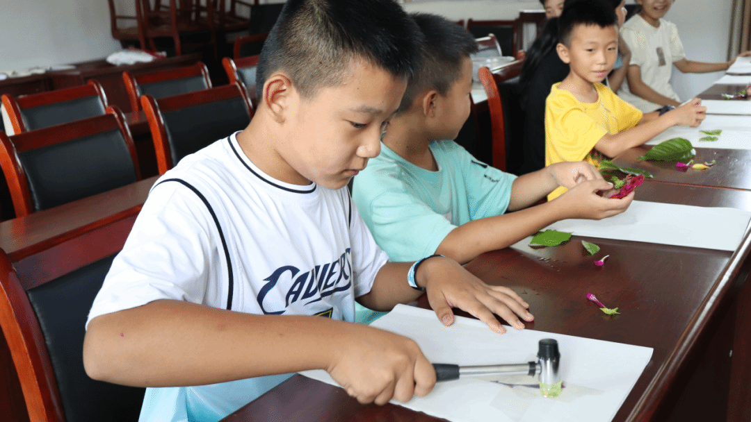植物是大自然的心理疗愈师,通过植物可以释放压力,在绿色中感受自然,感受生命,与大自然建立联系,促进心理健康发展。“植物大作战”活动分为“绿色冥想”“植物拓印”“植物领养”三个部分。冲头村植被覆盖率高,绿树青山环境优美,志愿者与小朋友来到户外,收集拓印所需要的植物,并进行绿色冥想,感受大自然的美好,培养他们的注意力与感受力。服务团通过营造一个充满自然元素的绿色环境,帮助人们调节情绪,缓解压力和焦虑。在绿色的包围下,人们能够感受到大自然的宁静与和谐,从而放松紧绷的神经,恢复内心的平静。