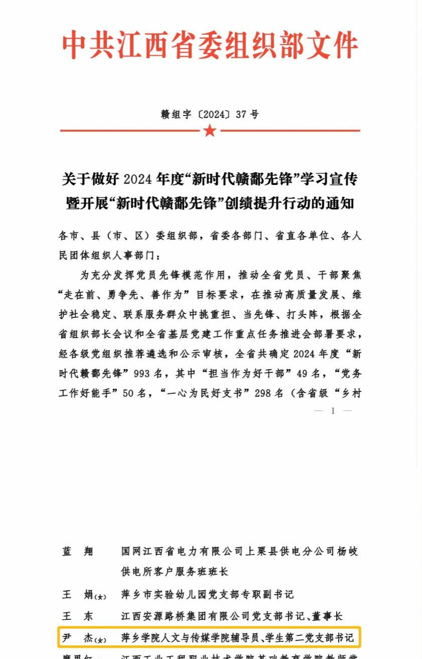 为充分发挥党员先锋模范作用,推动全省党员、干部聚焦“走在前、勇争先、善作为”目标要求,在推动高质量发展、维护社会稳定、联系服务群众中挑重担、当先锋、打头阵,近日,省委组织部公布了“2024年度‘新时代赣鄱先锋’学习宣传人选名单”,72886必赢欢迎光临学生第二党支部书记、辅导员尹杰被省委组织部确定为“新时代赣鄱先锋”学习宣传对象。