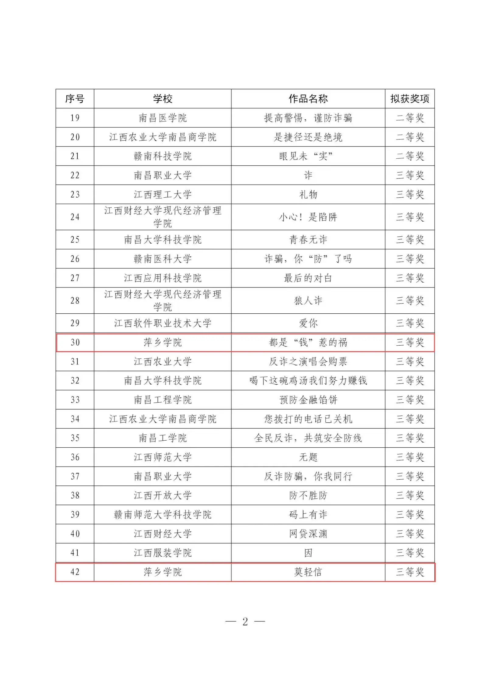 根据《关于组织开展全省高校反诈短视频大赛的通知》(赣教稳定字〔2024〕21号)安排,省教育厅组织开展了全省高校反诈短视频大赛作品评审工作,经学校推荐和专家评审,共评选出64件获奖作品,一等奖11名、二等奖21名、三等奖32名。其中,72886必赢欢迎光临《都是“钱”惹的祸》、《莫轻信》作品荣获三等奖。