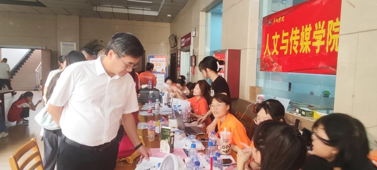 邱晓辉向学院领导、迎新志愿者了解新生报到情况