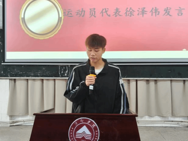 徐泽伟作为运动员代表上台发言。他指出体育不仅是运动,更是奥运精神“更高、更快、更强”的载体。他强调,在赛场上,运动员不仅要赛出水平、赛出成绩,更要赛出友谊、赛出风格。最后,他带领全体运动员进行宣誓,大家满怀热情,以坚定的语气宣读誓词,展示了他们对本次运动会的信心以及顽强拼搏、超越自我的决心。