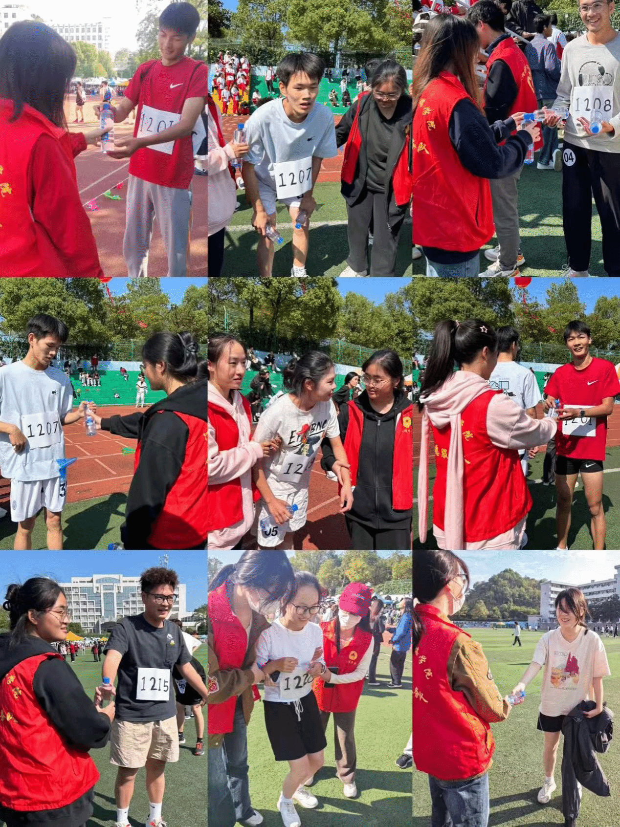 田径场上,入党积极分子们身着红色马甲,争分夺秒地奔赴在不同的比赛场地:铅球、跳高、赛跑、跳远等。入党积极分子身影匆匆,哪里有需要,哪里就有他们无私奉献的身影。当运动员冲过终点,入党积极分子们第一时间上前搀扶,热情地递上水与纸巾,让运动员在疲惫之余,感受到来自同学间的深切关怀与坚实支撑。绿茵场上,入党积极分子积极参与督导工作,维持着运动会期间的正常秩序,坚定地守护着在场的同学。观众席上,入党积极分子以饱满的热情和无私的奉献精神投身于运动会会场的卫生打扫工作:手持清洁工具,不辞辛苦地穿梭在操场的每个角落,让操场恢复往日的整洁与清新。从赛前的准备工作到赛后的清理打扫,每个细节都凝练着无数的心血和智慧,入党积极分子们在运动会赛场上四处奔波的身影,成为了运动会赛场上一道靓丽的风景。
