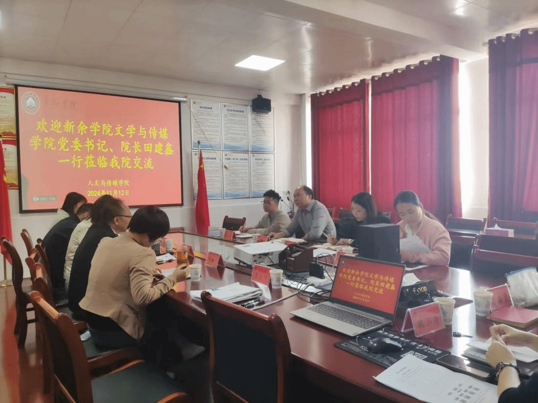 11月12日上午,新余学院文学与传媒学院党委书记、院长田建鑫一行抵达我校交流,座谈会于1401会议室召开。新余学院文学与传媒学院一行4人,72886必赢欢迎光临副院长凌焰、教学科研科科长邓红花、学工科科长罗珺及相关老师参会。会议由凌焰主持。