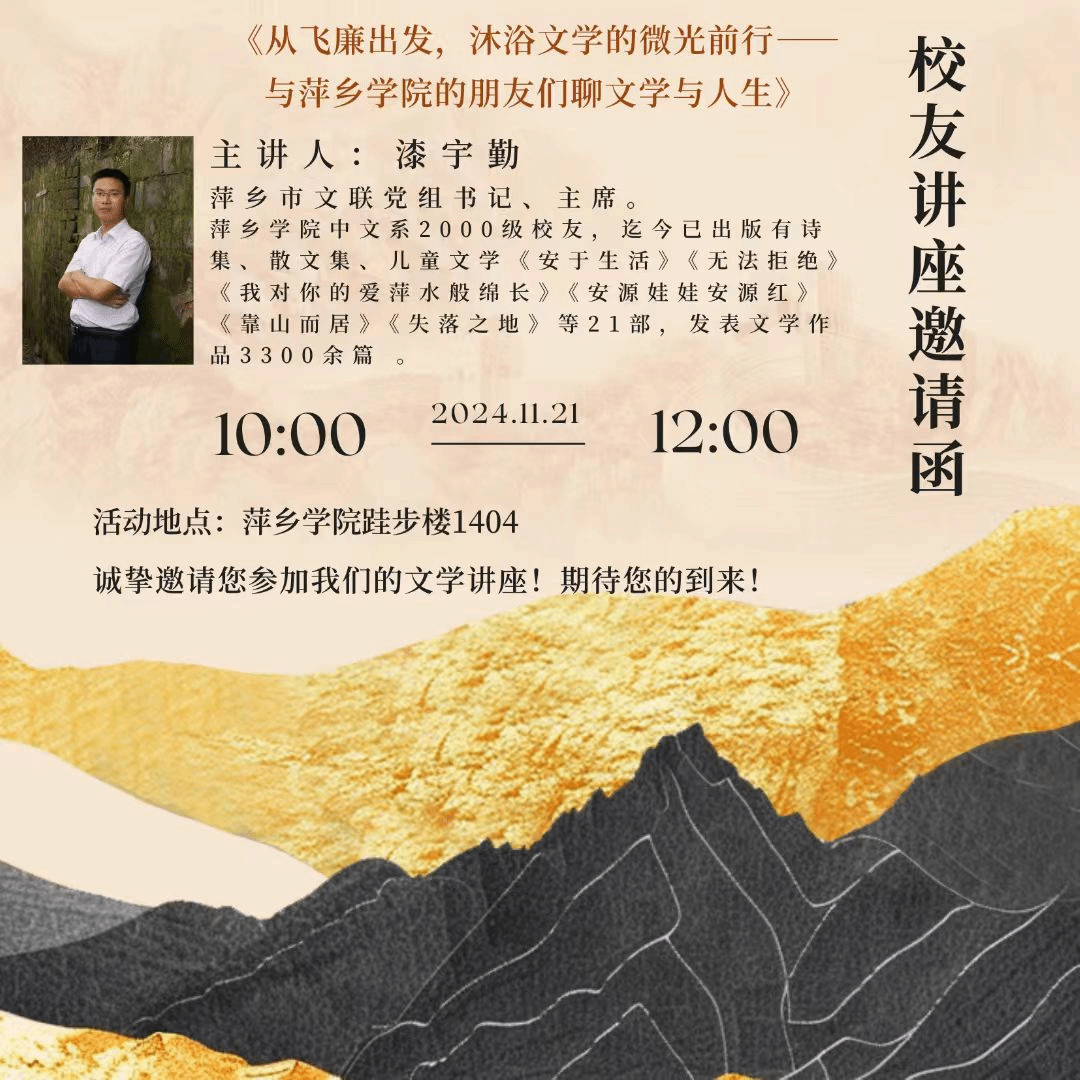 漆宇勤是萍乡学院中文系2000级校友,他擅长于诗歌、散文及小说的创作。他善于从日常生活中挖掘素材,并将生活中的细节转化为文学表达。本讲座漆宇勤先生将与萍乡学院的师生们分享他大学读书时的办社经历和后期创作经验,这是他文学创作与人生阅历的精粹呈现,是他多年来文学创作与他的生活史、精神史、人生感悟的解读、总结和新的思考,精义迭出。