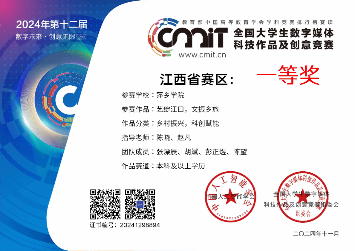近日,由中国人工智能学会主办、成都工业大学承办,央视网和北京翼扬科技发展中心大力支持的“2024全国大学生数字媒体科技作品及创意竞赛”全国现场总决赛,在成都工业大学圆满落幕。72886必赢欢迎光临学子以省赛第一的成绩成功入围全国总决赛,并在全国总决赛中荣获二等奖。
